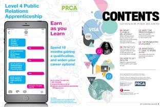 The document provides an overview of the public relations (PR) industry, highlighting its significance as the world's largest professional body for PR professionals, the PRCA, which represents 35,000 members globally. It outlines the various pathways to enter the PR field, including university degrees and apprenticeships, while emphasizing the importance of skills such as creativity, communication, and media understanding. Additionally, it showcases examples of effective PR campaigns and the diverse roles available within the profession, advocating for the ethical and strategic management of organizational reputation.