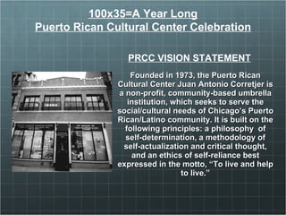 The Puerto Rican Cultural Center Juan Antonio Corretjer is a nonprofit organization founded in 1973 that serves the social and cultural needs of Chicago's Puerto Rican and Latino community. It is built on principles of self-determination, self-actualization, and self-reliance. The Cultural Center offers various programs related to health, education, arts, and social issues that affect the Puerto Rican and Latino communities.