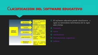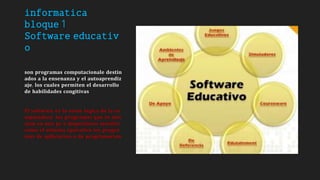 El documento describe el software educativo como herramientas para el aprendizaje, clasificándolo en varias categorías y destacando sus funciones y características. También se aborda la importancia de los algoritmos y diagramas de flujo en la resolución de problemas y la lógica de programación. Además, se mencionan herramientas informáticas avanzadas como procesadores de texto y hojas de cálculo, explicando su utilidad y funciones específicas.