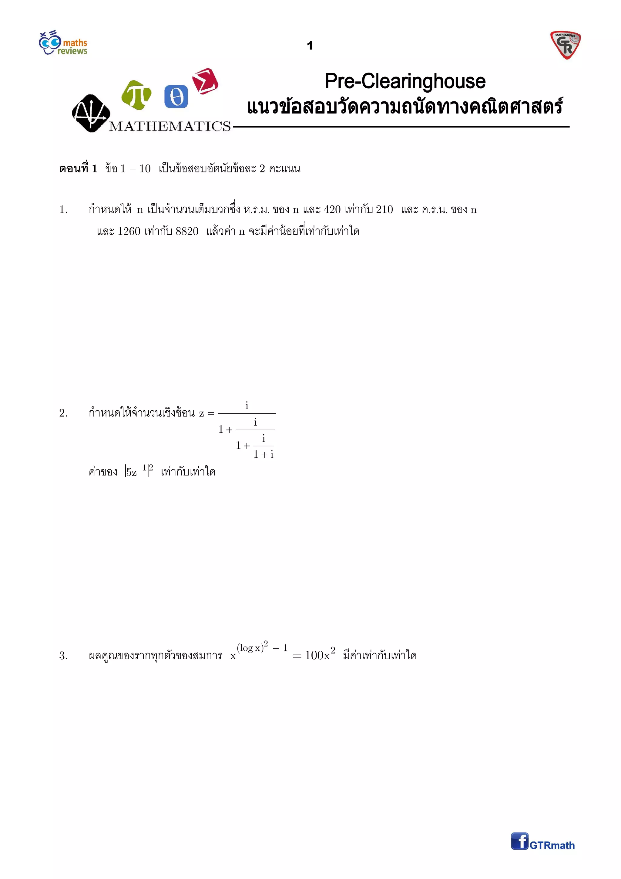 1. กําหนดให้ n เป็นจํานวนเต็มบวกซึง ห.ร.ม. ของ n และ 420 เท่ากับ 210 และ ค.ร.น. ของ n