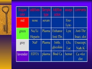 The document discusses various pre-analytical and post-analytical errors that can occur in clinical laboratories. It notes that errors commonly occur in specimen receiving, sampling, transport, and results reporting. Some common errors include entering the wrong patient data, incomplete patient information, misidentifying tests, collecting samples from patients with the wrong test orders, and not fulfilling all requested investigations. The document also discusses various biological and environmental factors that can influence laboratory test results, such as patient posture, exercise, underlying medical conditions, drug use, and diet. Proper specimen collection and handling is important to avoid pre-analytical errors.