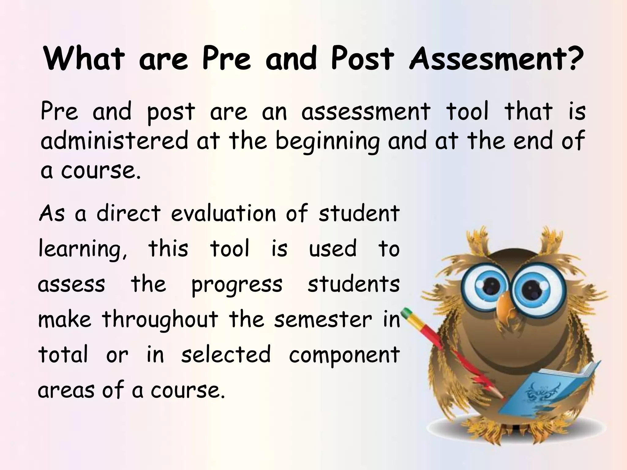 Pre and post assessments are used to measure student learning and progress throughout a course. Administered at the beginning and end of a course, pre-assessments establish a baseline of students' prior knowledge while post-assessments evaluate learning gains. This allows instructors to identify topics requiring more instruction and students needing additional help. Well-written pre and post assessment questions tied to learning objectives facilitate analyzing course strengths and weaknesses to improve learning.