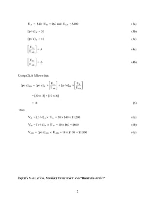 The document discusses pre-merger and post-merger price-to-earnings (P/E) ratios when firm A acquires firm B in an all-stock transaction. It shows that if markets rationally value the acquisition, the post-merger P/E ratio of firm A will equal a weighted average of the pre-merger P/E ratios of firms A and B, with the weights based on each firm's relative contribution to post-merger earnings. However, if investors mistakenly interpret the increase in earnings per share as a sign of high future growth, the post-merger P/E ratio may exceed the rational weighted average, temporarily inflating the stock price until the market recognizes its