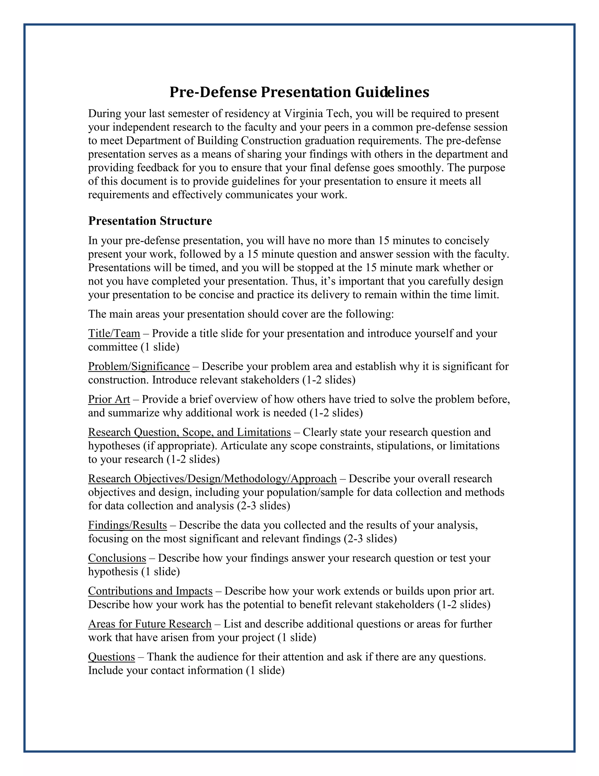 The document provides guidelines for Virginia Tech students to present their independent research work through a pre-defense presentation and poster. For the 15-minute presentation, students must concisely cover the title, problem statement, prior work, research questions, methodology, findings, conclusions, and future work using no more than 15 slides. The 24x36 inch poster must visually summarize these same elements on one board through graphics, text, and pictures designed simply with 18 point font or larger. Students must practice and receive feedback on their presentation and poster before the required pre-defense session.