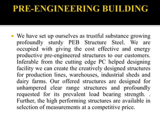 The document discusses the benefits of pre-engineered building (PEB) structures, which include reduced construction time, lower costs, adaptability, large clear spans, quality control, low maintenance, energy efficiency, architectural versatility, and single source responsibility. PEB structures are cost effective, energy efficient, and can be creatively designed for various industrial and agricultural buildings. Their standardized, prefabricated design allows for fast assembly and earlier project completion.