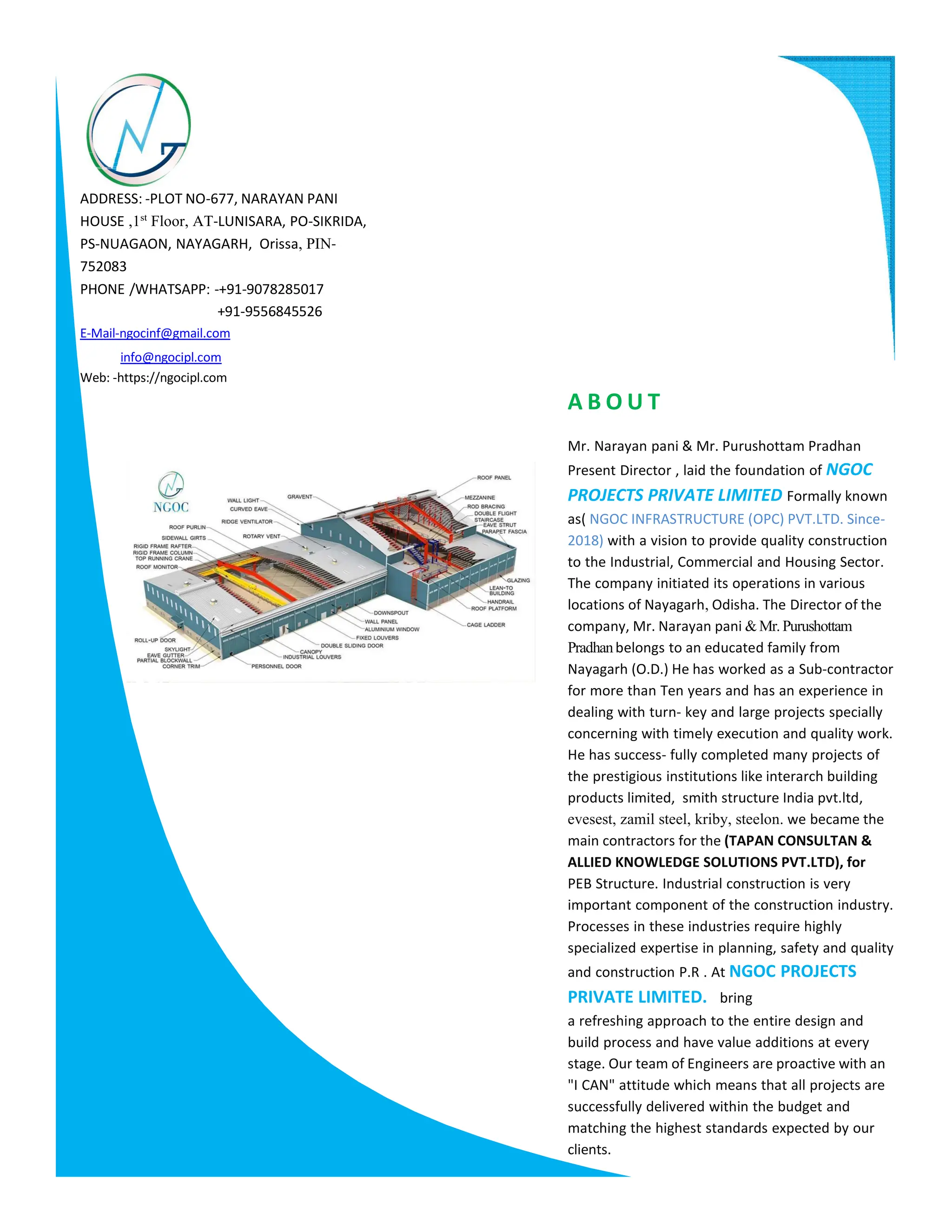 NGOC Projects Private Limited, founded in 2018, specializes in timely and quality construction services for industrial, commercial, and housing sectors in Odisha, India. Led by experienced directors, the company emphasizes safety, innovation, and collaboration with clients to deliver efficient construction solutions. Their services include various industrial constructions, steel fabrication, and project management, with a commitment to quality and client satisfaction.
