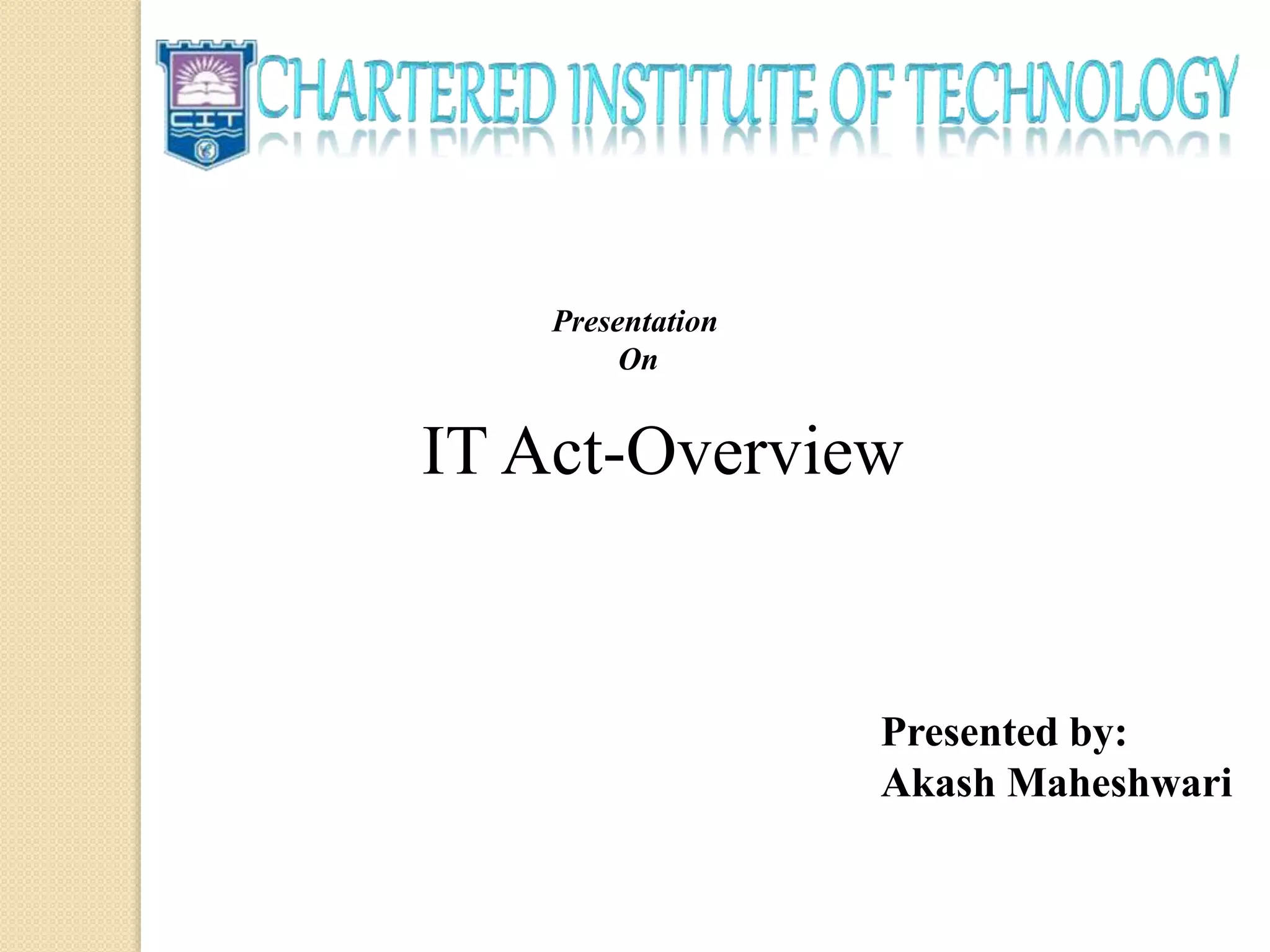 The document provides an overview of the IT Act in India through discussing key topics like the objectives of the Act, cyber crimes and provisions under the Act. It notes that the Act aims to provide legal recognition to electronic transactions and storage of data. It also describes various cyber crimes like hacking, data theft and publishing obscene content, as well as amendments made in 2008 to address issues like data protection. Case studies are presented on crimes such as blackmailing, bank fraud, and hacking into websites to illustrate how the IT Act handles such offenses.