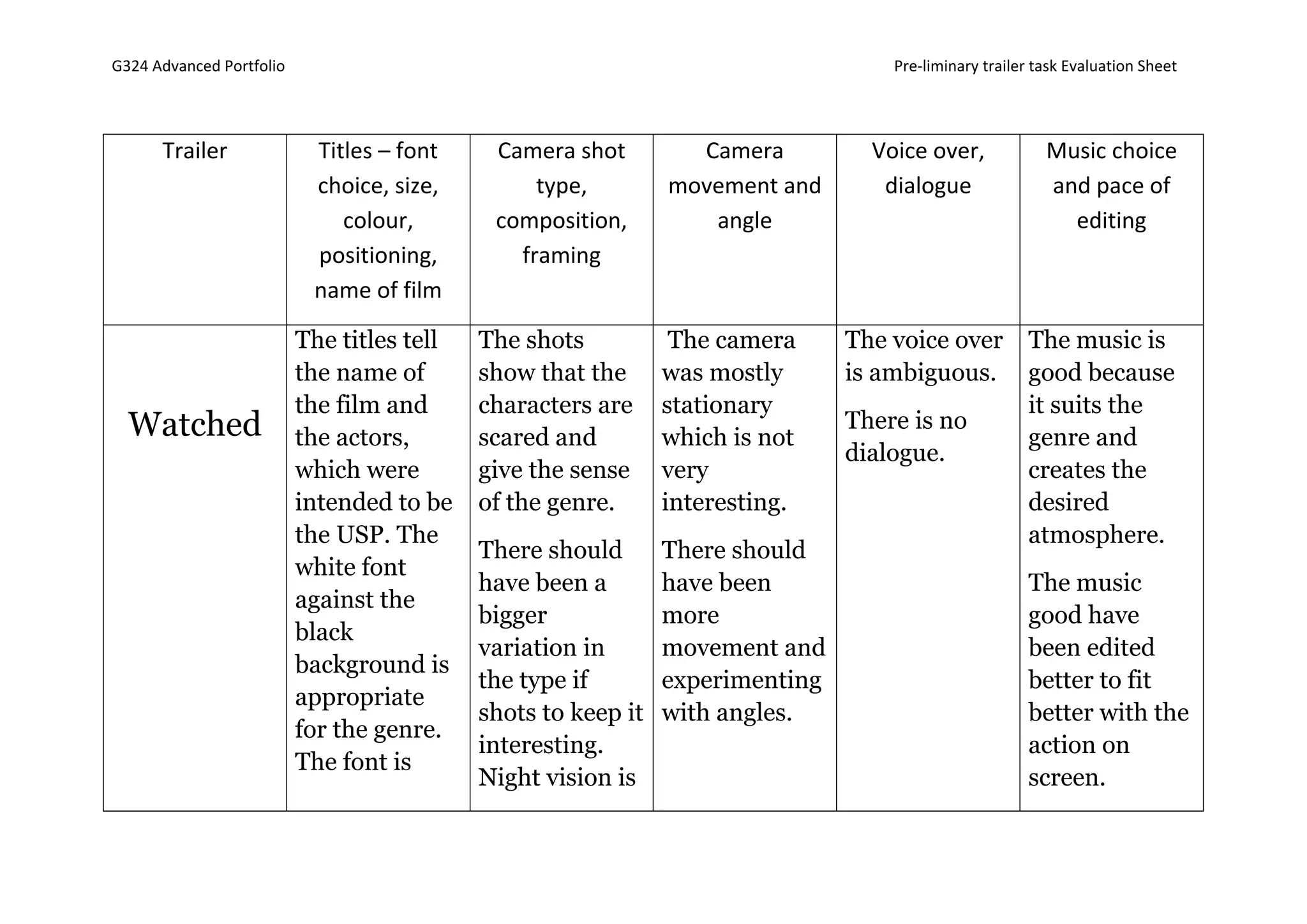 For Watched, the evaluator notes the titles were effective but the camera work lacked movement and variation in shots. For Trapped, they found the title design and shot variety kept the audience interested. The Caretaker received praise for its movement between shots and use of music to set the pace and genre.