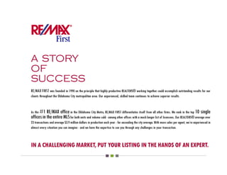 RE/MAX First was founded in 1990 and has become the #1 RE/MAX office in the Oklahoma City metro area. It ranks in the top 10 single offices in the entire MLS for both units and volume sold. George Massey is a REALTOR® with RE/MAX First and has extensive experience helping clients buy and sell residential and commercial real estate in the