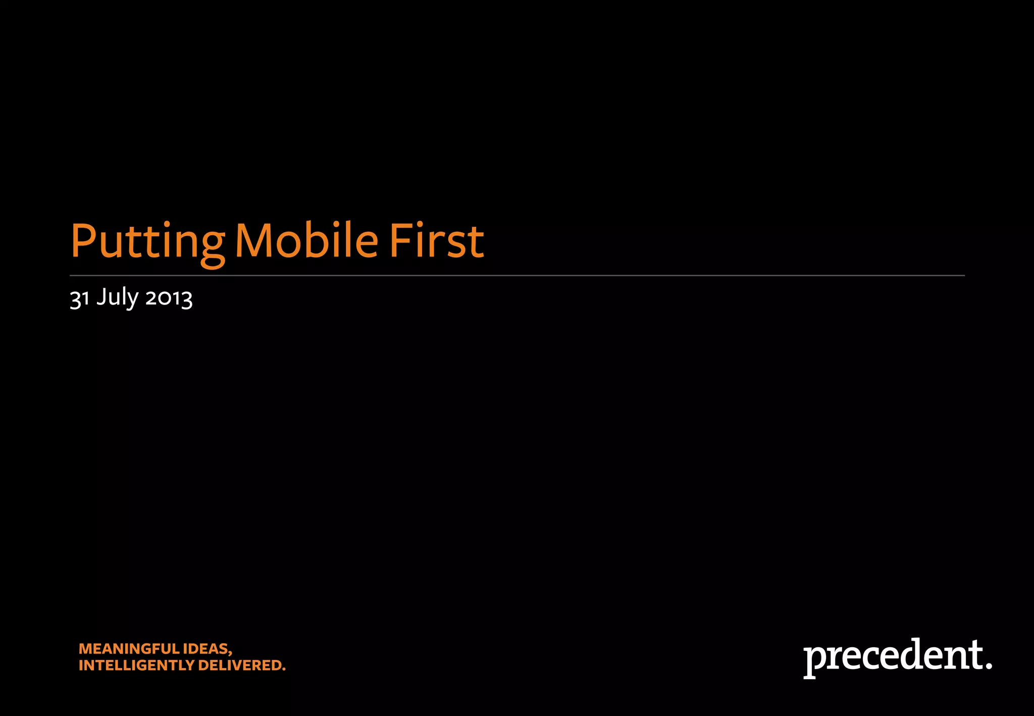 The document discusses strategies for putting mobile first in design and development. It covers analyzing the changing mobile landscape, identifying opportunities, design considerations, and approaches. Key points include: