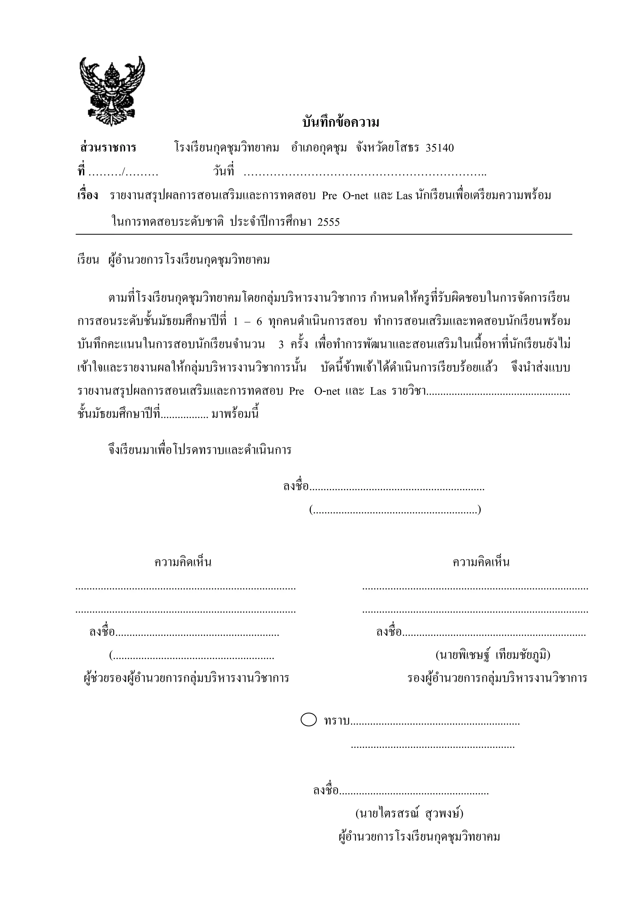 วนราชการ โรงเรี ยนกุดชุมวิทยาคม อาเภอกุดชุม จังหวัดยโสธร 35140 ที่ ………/……… วันที่ ……………………………………………………….. เรื่อง รายงานสรุ ปผลการสอนเสริ มและการทดสอบ Pre O-net และ Las นักเรี ยนเพื่อเตรี ยมความพร้อม ในการทดสอบระดับชาติ ประจาปี การศึกษา 2555 เรี ยน ผูอานวยการโรงเรี ยนกุดชุมวิทยาคม ้ ตามที่โรงเรี ยนกุดชุมวิทยาคมโดยกลุ่มบริ หารงานวิชาการ กาหนดให้ครู ที่รับผิดชอบในการจัดการเรี ยน การสอนระดับชั้นมัธยมศึกษาปี ที่ 1 – 6 ทุกคนดาเนินการสอบ ทาการสอนเสริ มและทดสอบนักเรี ยนพร้อม บันทึกคะแนนในการสอบนักเรี ยนจานวน 3 ครั้ง เพื่อทาการพัฒนาและสอนเสริ มในเนื้ อหาที่นกเรี ยนยังไม่ ั เข้าใจและรายงานผลให้กลุ่มบริ หารงานวิชาการนั้น บัดนี้ขาพเจ้าได้ดาเนิ นการเรี ยบร้อยแล้ว จึงนาส่ งแบบ ้ รายงานสรุ ปผลการสอนเสริ มและการทดสอบ Pre O-net และ Las รายวิชา................................................... ชั้นมัธยมศึกษาปี ที่................. มาพร้อมนี้ จึงเรี ยนมาเพื่อโปรดทราบและดาเนินการ ลงชื่อ.............................................................. (..........................................................) ความคิดเห็น ความคิดเห็น .............................................................................. ................................................................................ .............................................................................. ................................................................................ ลงชื่อ.......................................................... ลงชื่อ................................................................. (......................................................... (นายพิเชษฐ์ เทียมชัยภูมิ) ผูช่วยรองผูอานวยการกลุ่มบริ หารงานวิชาการ ้ ้ รองผูอานวยการกลุ่มบริ หารงานวิชาการ ้ ทราบ............................................................ .......................................................... ลงชื่อ..................................................... (นายไตรสรณ์ สุ วพงษ์) ผูอานวยการโรงเรี ยนกุดชุมวิทยาคม ้