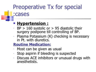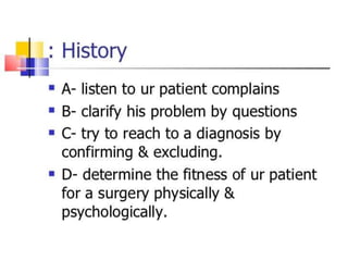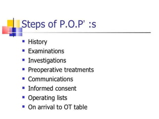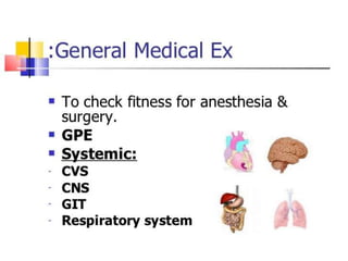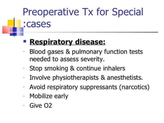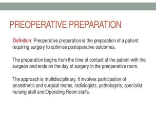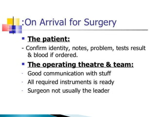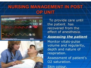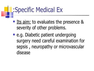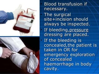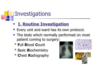 X-rays are the basic investigation used in orthopedics, especially for fractured bones, pre-operative and post-operative assessments, and checking for bone tumors. During surgery, the patient is monitored and stabilized hemodynamically, with oxygen levels, ECG, blood pressure, and CO2 monitored. Blood or saline may be transfused if needed, and antibiotics and temperature control are provided. Post-operative complications can include shock, DVT, tetanus, gas gangrene, fever, fat embolism, delirium tremors, blisters, bed sores, torn muscle fibers, tissue atrophy, tendon tears, nerve compression, vascular injuries, bleeding, compartment syndrome, infections, malun