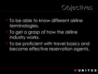 The document provides a comprehensive overview of various airline terminologies and concepts essential for understanding the airline industry, particularly for those aspiring to work as reservation agents. Key terms covered include airline and airport codes, types of flights, ticketing options, and membership programs. Additionally, the document explains fare constructions, itinerary types, and ticketing processes, with a focus on United Airlines' operations and terminology.