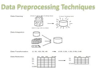 Data preprocessing is a technique used to prepare raw data for data mining by cleaning data, handling missing values, smoothing noisy data, and reducing data size. It involves techniques such as data cleaning, integration, transformation, and reduction. Data cleaning identifies and removes errors and inconsistencies. Data integration merges data from multiple sources. Data transformation operations like normalization prepare data for certain algorithms. Data reduction reduces data size through aggregation, attribute selection, and other techniques. Preprocessing resolves issues in raw data to improve data mining results.