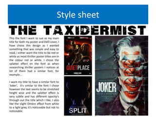 This document discusses pre-production planning for a thriller film poster and DVD cover project. It includes details on font and color scheme choices, as well as references to existing thriller products. Potential issues and solutions are outlined, such as ensuring photos are properly lit and saved. Health and safety considerations are also noted, such as taking breaks to avoid headaches during editing.