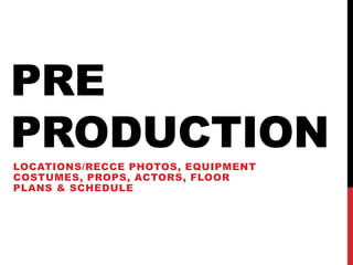 This document provides production details for a music video, including equipment, costumes, locations, actors, and schedules. It outlines the camera, lens, tripod, and SD card that will be used. It describes the costumes for the three main actors and includes location recce photos. Floor plans show the camera and actor positioning. Comprehensive schedules are provided for pre-production, production, and post-production, including editing. An evaluation and packaging schedule is also included.