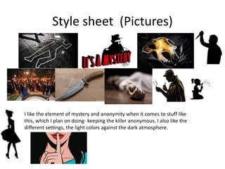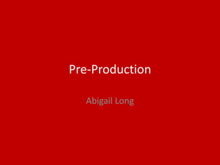 The document outlines Abigail Long's pre-production plans for a short film about a masquerade ball murder mystery. It includes style sheets exploring lighting, colors, and fonts. Layout designs and potential props and locations are presented. Contingency plans address technical issues. A health and safety section considers risks. An 8-day production schedule is proposed to film props, dancing, dialogue, and a death scene, then add sound effects in post-production.
