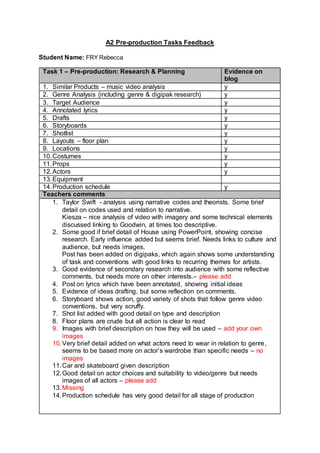 This document provides feedback on a student's pre-production tasks for a music video project. The teacher provides comments on each task, noting what was done well and areas for improvement. Overall the work was good but some sections like costumes, locations, and actors needed more details or images. The student created an action plan to address the feedback by adding more images, rewriting descriptions, and scanning documents. For their work addressing the feedback, the student improved their mark from 13/20 to 16/20.