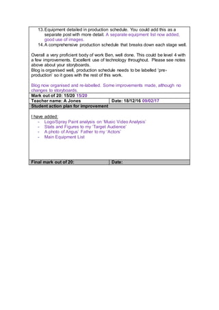 This document provides feedback from a teacher to a student, Ben Walker, on pre-production tasks for a music video project. The teacher confirms Ben completed research on similar music videos, genre analysis, target audience, annotated lyrics, storyboards, shotlists, floor plans, locations, costumes, props, and actors. The feedback notes some areas for improvement, such as adding more details to storyboards. It also recommends labeling the production schedule as "pre-production" for clarity. The student action plan shows changes made in response to the feedback. The teacher awards Ben 15 out of 20 initially, then fully after improvements were made.