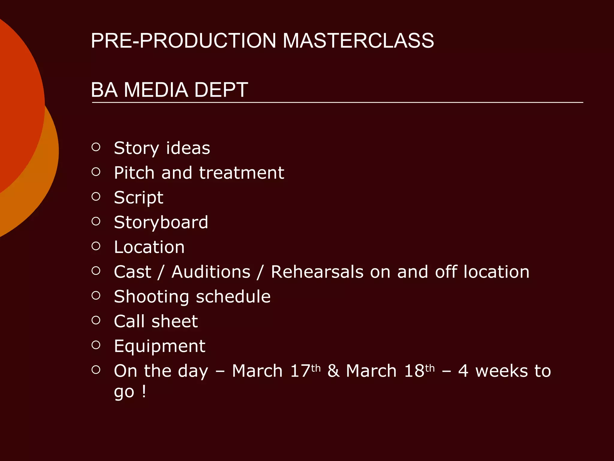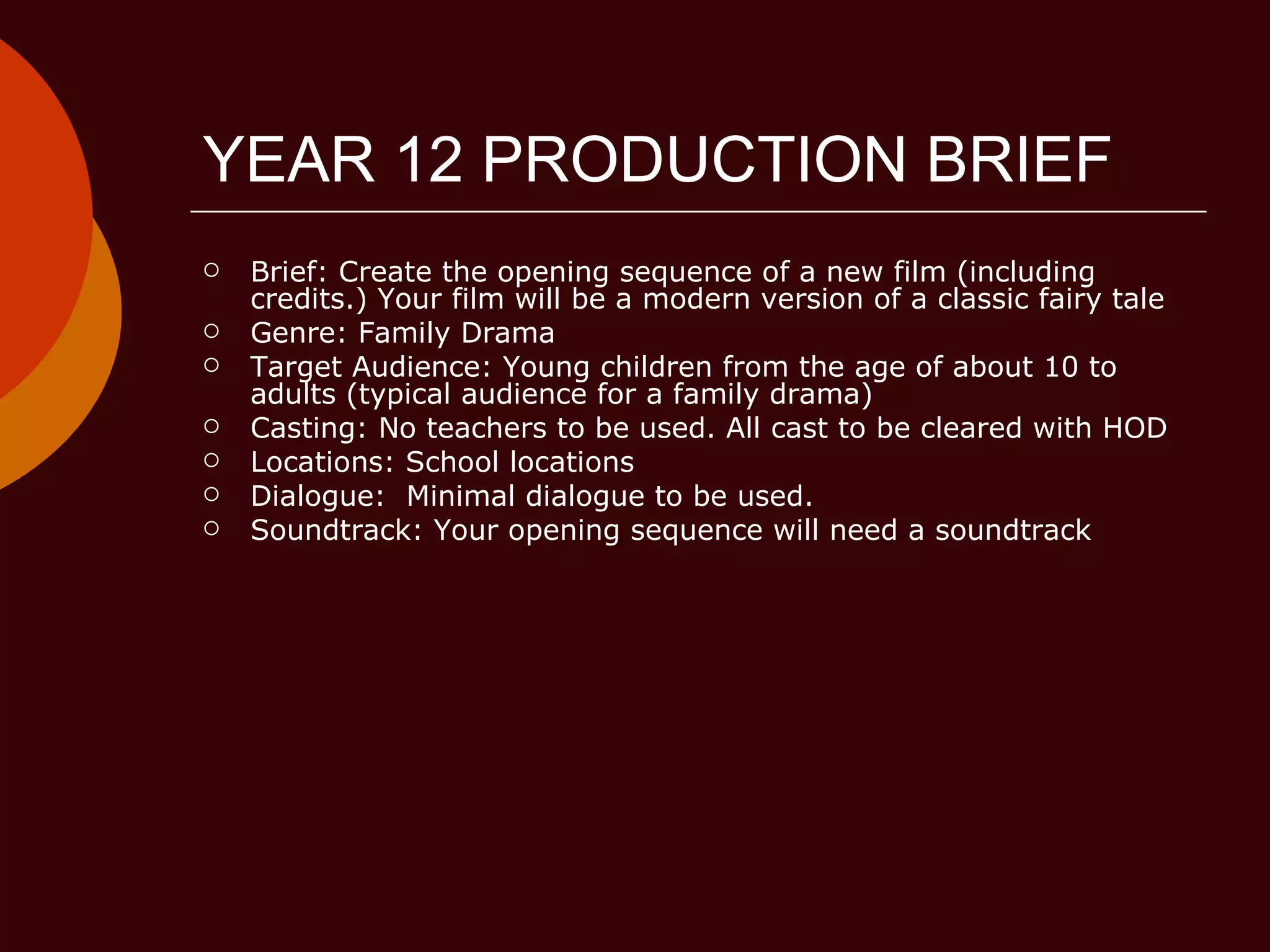 This document provides guidance for students creating the opening sequence of a film adaptation of a classic fairy tale for a school assignment. It outlines the key pre-production elements like story ideas, scriptwriting, storyboarding, casting, locations, and scheduling. Students are expected to hold production meetings to plan shoots, use minimal dialogue, and get approval for their cast and locations from their Head of Department. Safety and backup shots are emphasized for the filming.