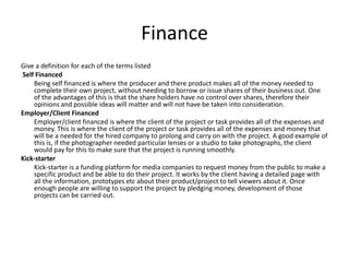 The document discusses various pre-production techniques for financing a project, including being self-financed, employer/client financed, and kickstarter. It recommends using kickstarter to fund a recipe card project for vegetarians, as that audience would be most likely to support it. It also lists aspects of production that require financing like personnel, equipment, ingredients. Methods to stick to deadlines like planning ahead and organization are suggested. Contingency time allows for unexpected delays. Legal requirements like location/model release forms and copyright must also be considered.