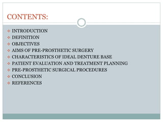 Pre-prosthetic surgery is essential for patients who cannot effectively use dentures due to issues like bone atrophy and localized tissue problems. The surgery aims to modify hard and soft tissues to facilitate the fitting of prosthetics while ensuring stability and retention. Key procedures include alveolectomy, alveoloplasty, and various other surgeries to address bone and soft tissue deformities, tailored to enhance patient comfort and prosthetic success.
