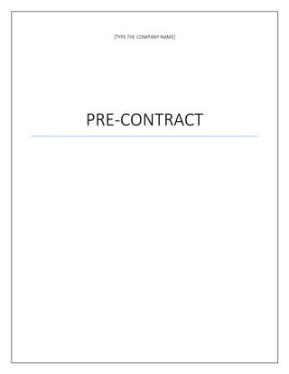 The document discusses pre-qualification of contractors for construction projects. It describes the typical stages of pre-qualification which include inviting applicants, selecting tenders, evaluating applicants based on criteria like experience, equipment, finances, and litigation history, selecting a suitable applicant, and forming a contract. Key criteria for evaluating applicants are also explained such as financial capacity, experience, technical capacity, and litigation history. An example matrix for analyzing and selecting contractors is provided. The use of standard bidding documents from ICTAD is also discussed. Lump sum contracts are described as being dependent on firm quantities and specifications in the bidding documents. Risks to contractors from price fluctuations in lump sum contracts are noted.