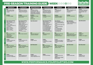 This document outlines a 6-week pre-season training guide with a weekly schedule that includes meals, snacks, and workouts for each day. The schedule provides details on breakfast, lunch, dinner and snack options as well as interval, strength and technique workouts. The goal is to improve performance through a regimented plan that focuses on nutrition, conditioning and skill development.