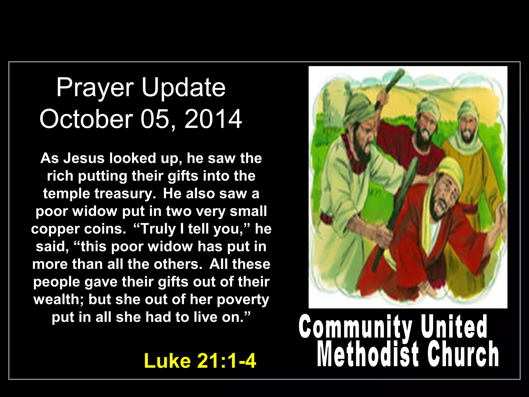 This document provides a prayer update which includes a Bible verse about a poor widow donating more than wealthy donors. It lists prayer concerns for Marion MacDonald and members of the armed services and congregation who cannot attend. It also announces upcoming church events like meetings, a luncheon, breakfast, Bible study, and a fall bazaar.