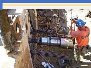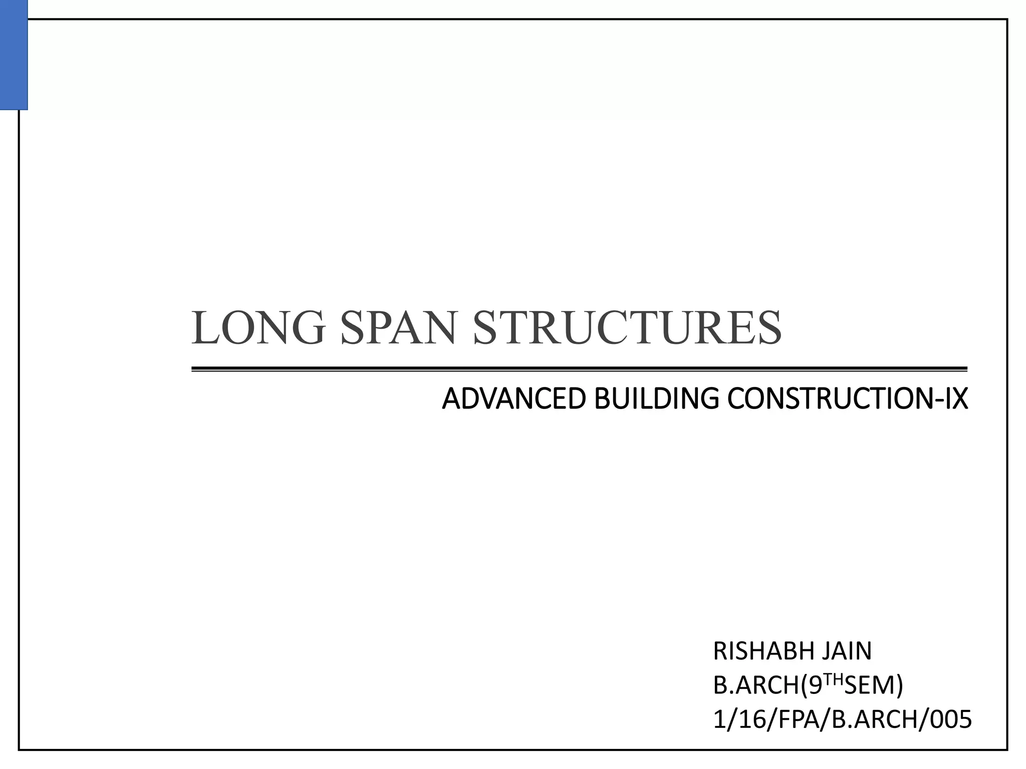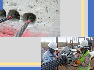 The document discusses advanced building construction techniques focusing on pre-tensioning and post-tensioning of prestressed concrete structures. It details the components used in prestressing, the methods of pre-tensioning and post-tensioning, their applications, and the differences between them. Additionally, it highlights the advantages of using prestressed concrete in large-span constructions like bridges and office buildings.
