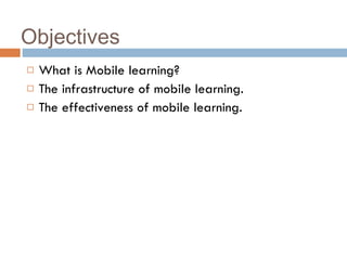 Mobile learning allows learning to happen anywhere using portable technologies. It requires an infrastructure to support learning across locations on mobile devices. Research has found mobile learning can be an effective way to learn by taking advantage of opportunities outside the classroom and accessibility of learning from any location.