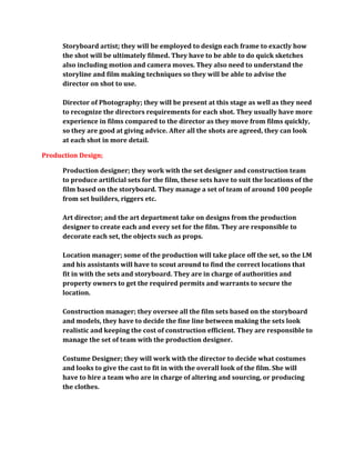 The document outlines the roles and responsibilities of key personnel in the pre-production phase of filmmaking. It discusses the roles of the casting director, editor, head of sound, director of photography, production designer, line producer, and others. It also covers planning for casting, storyboards, production design, special effects, and the production unit/finances.