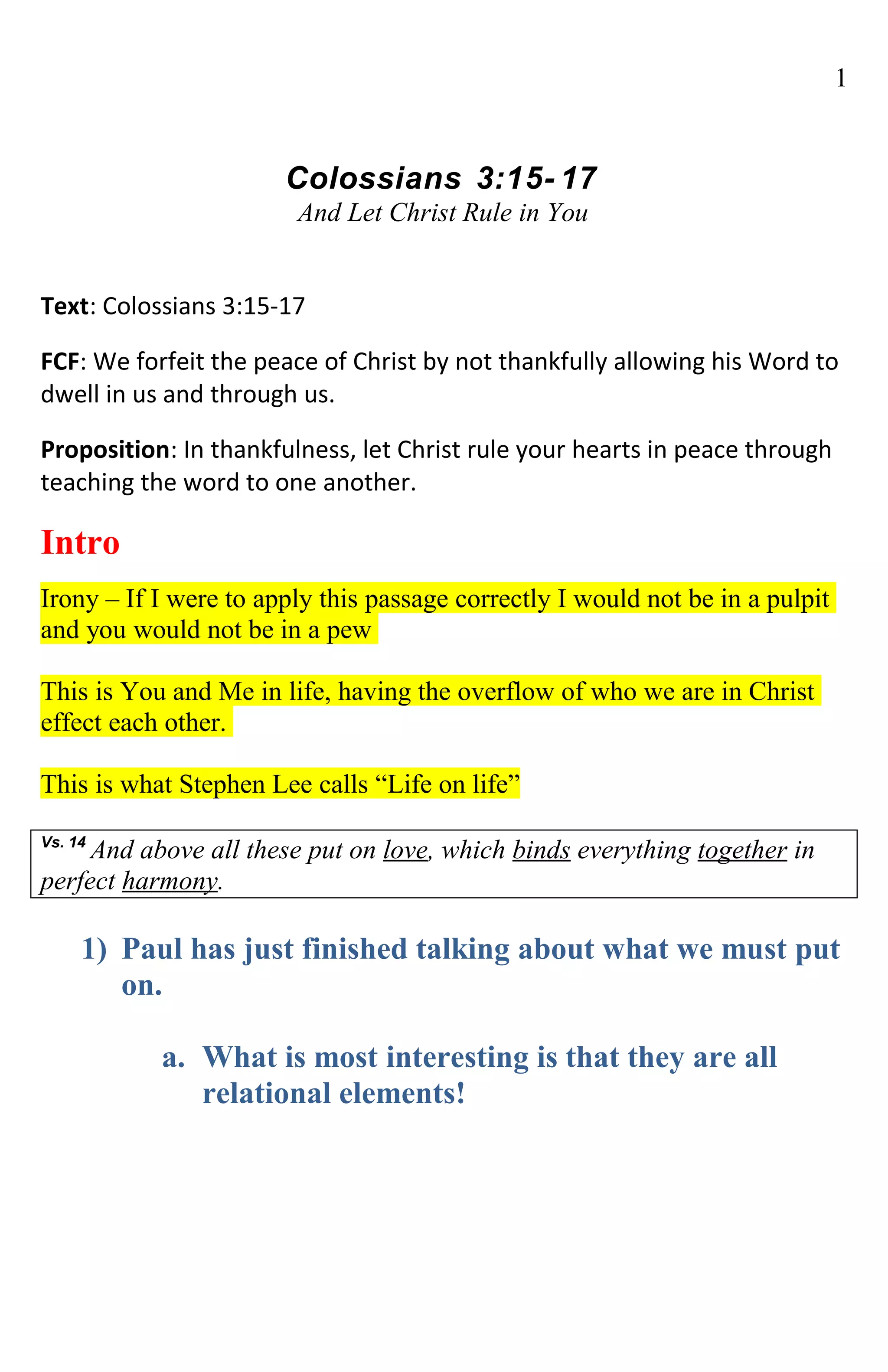 This passage discusses how to let Christ rule in your heart through thankfulness. It says to allow the peace of Christ to rule your heart so that you are unified with other believers. It then says to let the word of Christ dwell in you richly so that you can teach and admonish one another with wisdom. Thankfulness for what Christ has done is what will fuel allowing him to rule your heart and bring unity through his word.