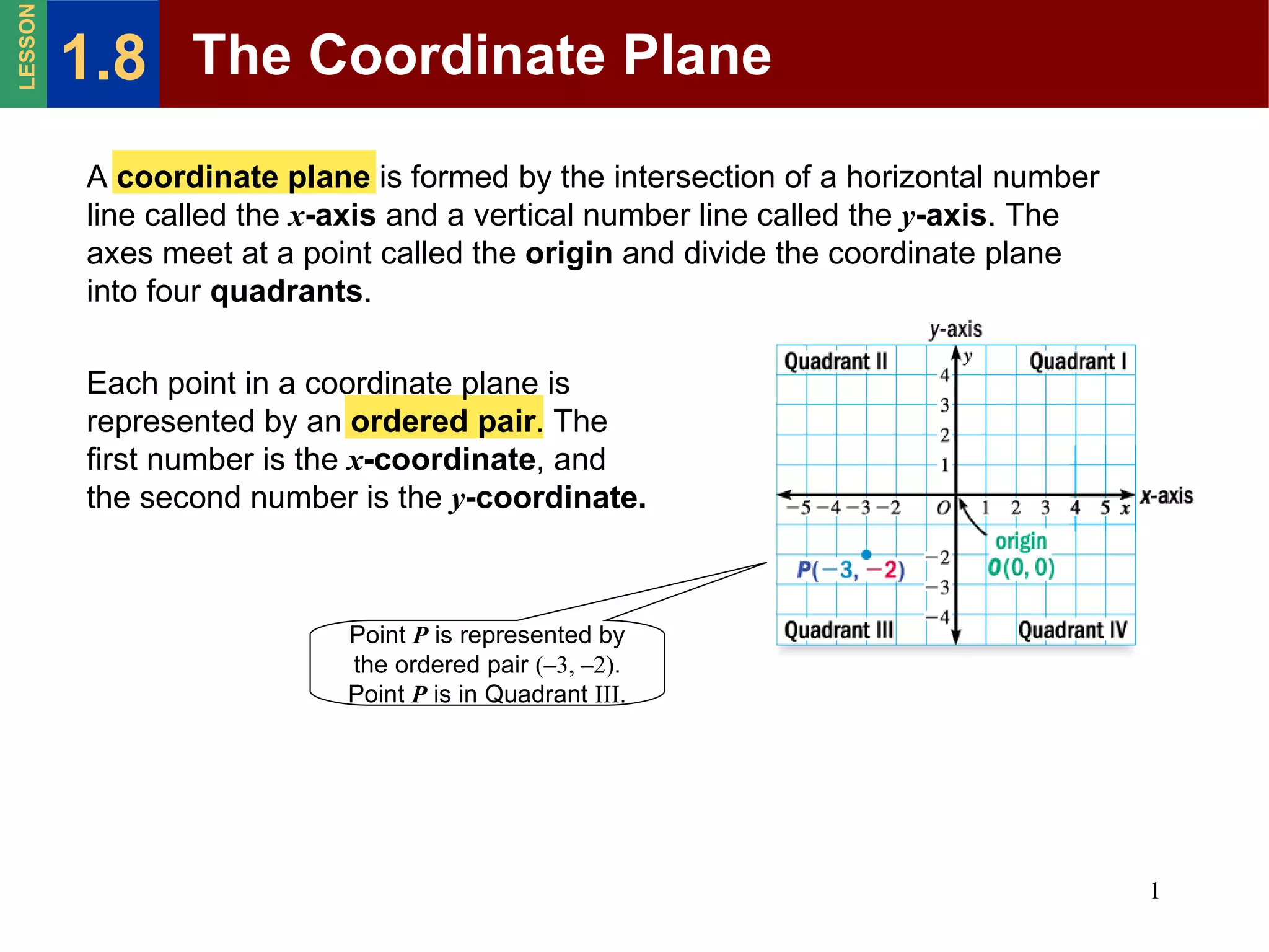 The document describes key concepts about the coordinate plane, including that it is formed by the intersection of the x-axis and y-axis at the origin point, dividing it into four quadrants. Points on the coordinate plane are represented by ordered pairs using their x-coordinate and y-coordinate. Examples are given of plotting points from their coordinates and reading point locations. A scatter plot on a coordinate plane can show relationships between paired data by plotting each data pair as a point.
