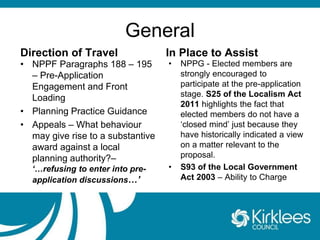 The document discusses Kirklees' approach to pre-application advice, which has shifted from a free duty officer system to a paid pre-application service. The new approach involves joint working between regeneration and development management teams on major applications, with assigned officers and written responses. Feedback indicates businesses appreciate the more collaborative approach and that the pre-application service generates income while improving development management performance.
