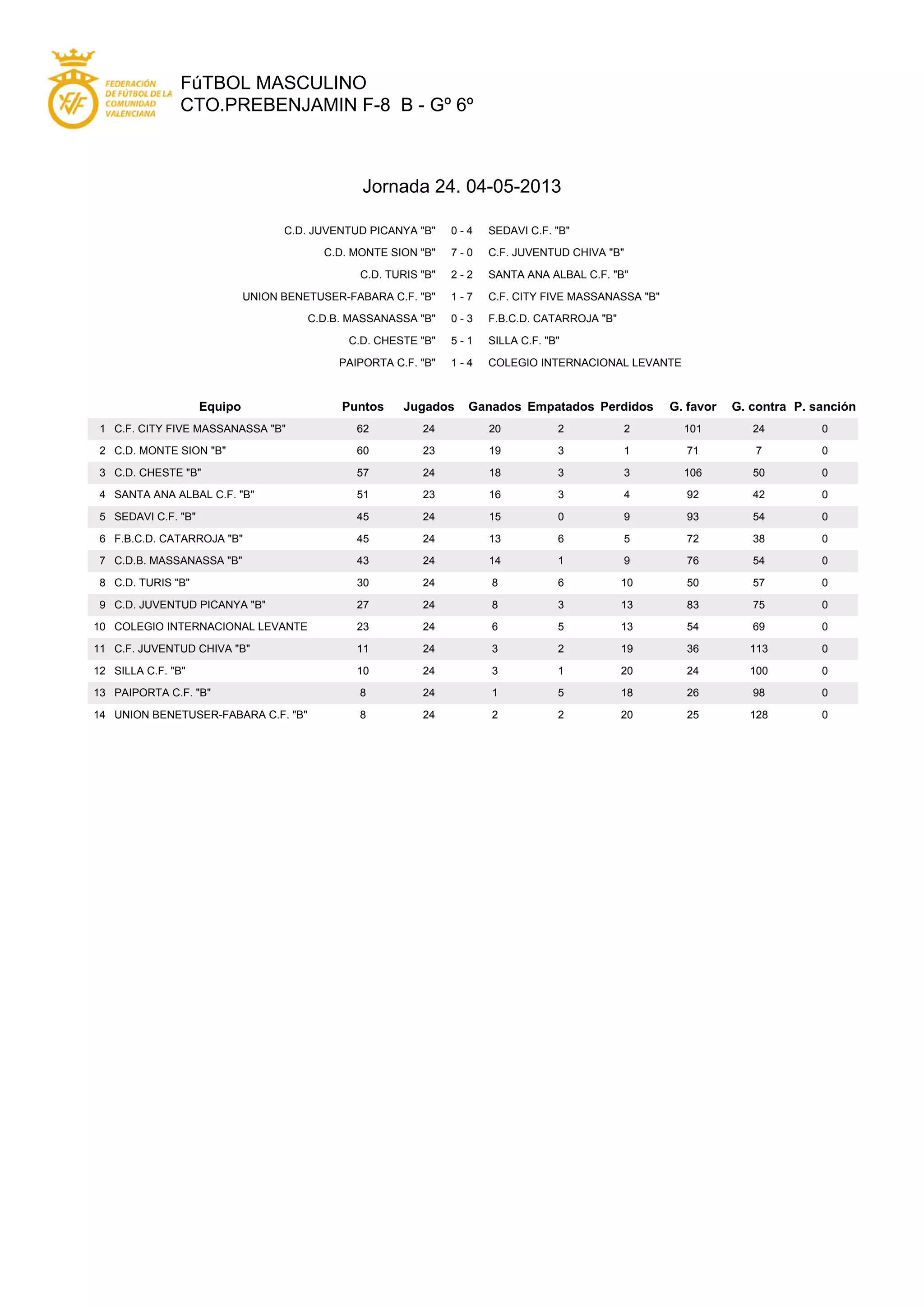 This document summarizes results from the 24th matchday of men's football league games in the 6th division F-8 B category. City Five Massanassa B won 7-1 against Union Benetuser-Fabara B. Monte Sion B defeated Juventud Chiva B 7-0. Turis B and Santa Ana Albal B tied 2-2. City Five Massanassa B leads the overall standings with 62 points.