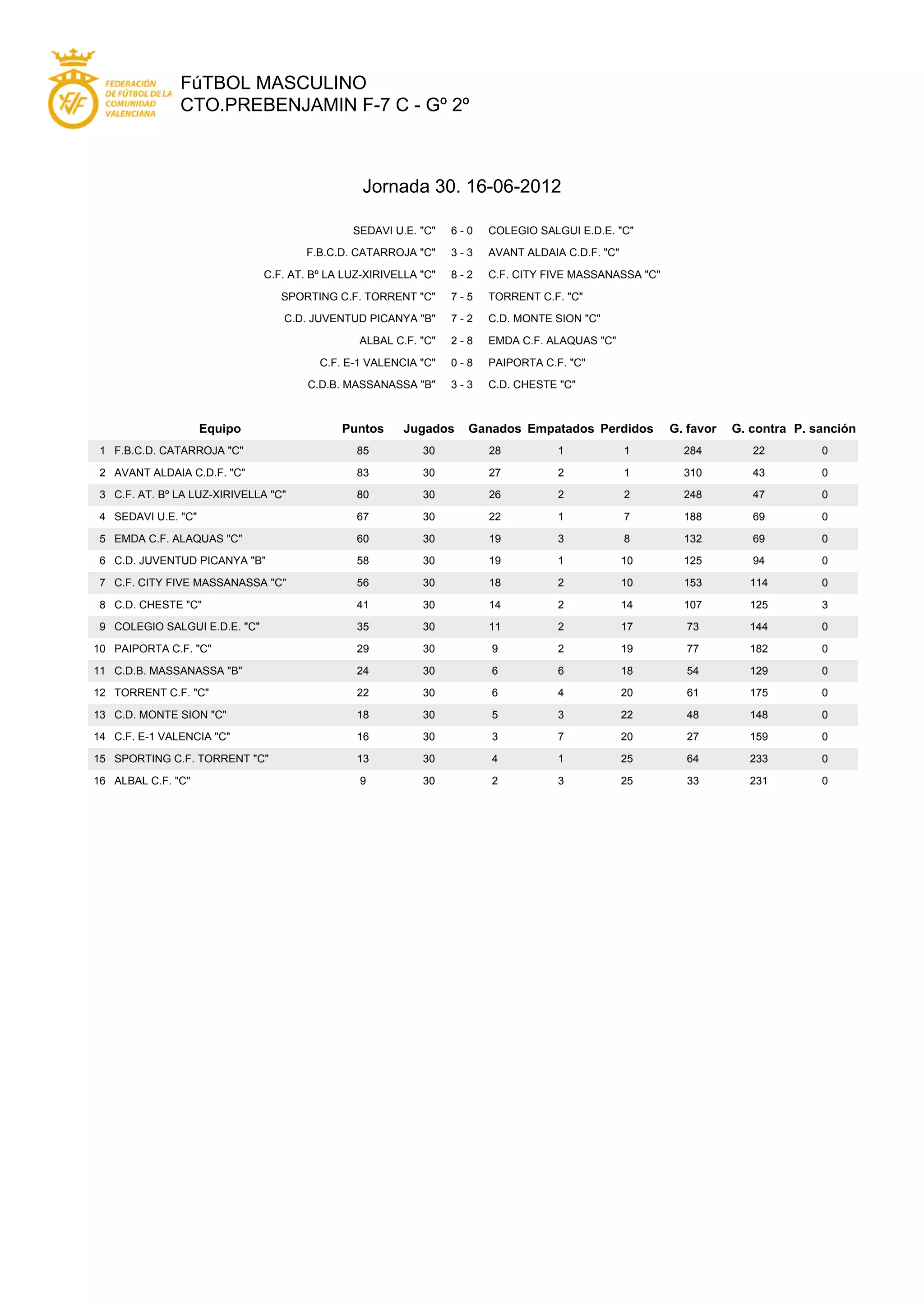 This document summarizes the results of the 30th matchday of the Prebenjamin F-7 C - Go 2o football league. It lists the results of 8 matches played, along with the current league standings. F.B.C.D. Catarroja "C" leads the league with 85 points after 30 matches played, having won 28, drawn 1 and lost 1. They have scored 284 goals and conceded 22.