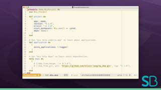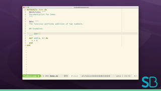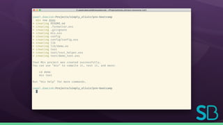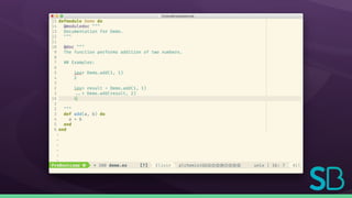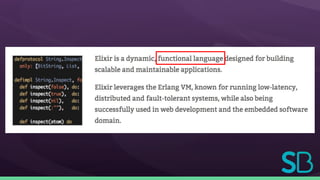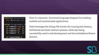 This document provides an introduction to the Elixir programming language. It discusses what Elixir is, how to get started with installation and configuration of Elixir and Erlang, basic and compound data types in Elixir, functions and modules, and higher-order functions and comprehensions. Key topics covered include installing Elixir using ASDF, basic data types like integers, floats, atoms, and more, functions and anonymous functions, modules, and Enum functions like map, reduce, and comprehensions.