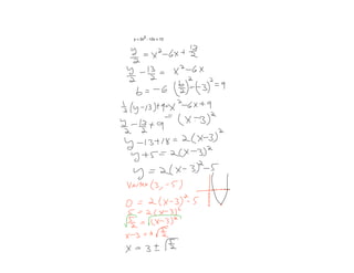 The document discusses a projectile motion problem where a projectile is shot straight up from 6 meters with an initial velocity of 80 m/s. The height of the projectile after t seconds is given by the equation h = 6 + 80t - 5t^2. It asks to find the time when the projectile reaches its maximum height and what that maximum height is. It then lists homework assignments and upcoming tests, including a pre-test tomorrow and a test on Thursday on the next unit of trigonometry.