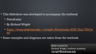 • https://www.andrews.edu/~rwright/Precalculus-RLW/Text/TOC.ht