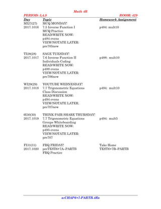 This document contains the schedule for Math 4R for the period of October 10-31, 2017. It lists the daily topics, homework assignments, and activities for each class period. The topics include trigonometric properties, special graphs, sum and difference formulas, double and half angle formulas, and inverse and trigonometric functions. Homework each day involves reading textbook pages and problems, as well as viewing online video supplements. Assessment activities include multiple choice questions, coding individually, class discussions, group whiteboarding, and free response questions.