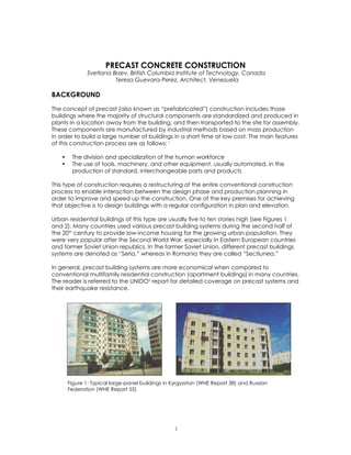 1) Precast concrete construction involves producing standardized structural components in a plant away from the construction site and transporting them for assembly. This allows for mass production and faster, cheaper construction of buildings.