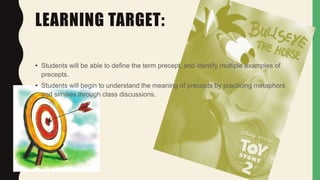 This document discusses the concept of kindness and precepts from the book Wonder. It provides learning targets about defining precepts and understanding them through discussion. It summarizes a part of the book where the main character August deals with bullying but makes friends. It discusses how one student stood up for August, changing how he was treated. The document encourages students to start positive movements by being kinder than necessary, like the quote from the book advises. It provides examples of small kind acts and assigns writing a favorite precept on an index card.