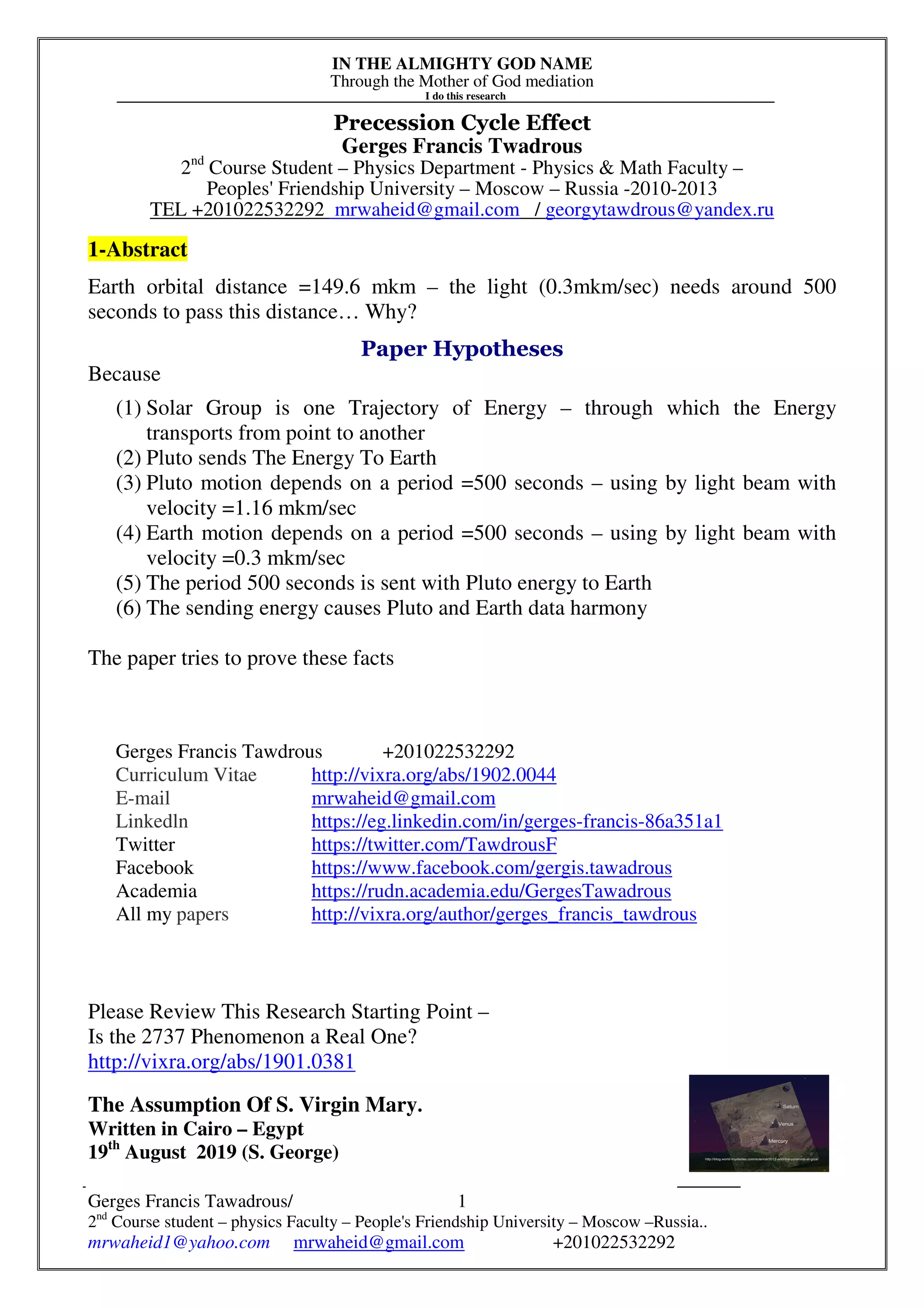 The research conducted by Gerges Francis Tawadrous, a physics student, presents a hypothesis regarding the interaction of celestial bodies and the transmission of energy across the solar system, hypothesizing that solar planets are interconnected through a single energy trajectory. The study analyzes data on planetary motions and suggests the existence of a secondary light velocity at 1.16 mkm/sec, proposing that both matter and space are composed of energy. It concludes that the solar system operates as an integrated entity, where the movements of planets are interdependent, reflecting a unified system governed by common physical properties.
