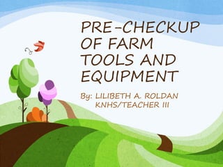 This document provides instructions for prepping farm tools and equipment before use. It discusses cleaning tools by removing rust with a wire brush or sandpaper. Tools should then be sharpened, maintaining their original bevel or angle. Whetstones and files should be used diagonally and away from the body. Moving parts should be disassembled and cleaned, then reassembled after applying oil. Worn tools should be fixed or replaced to prevent accidents. The document includes a pre-test and answer key to assess understanding of the proper techniques.