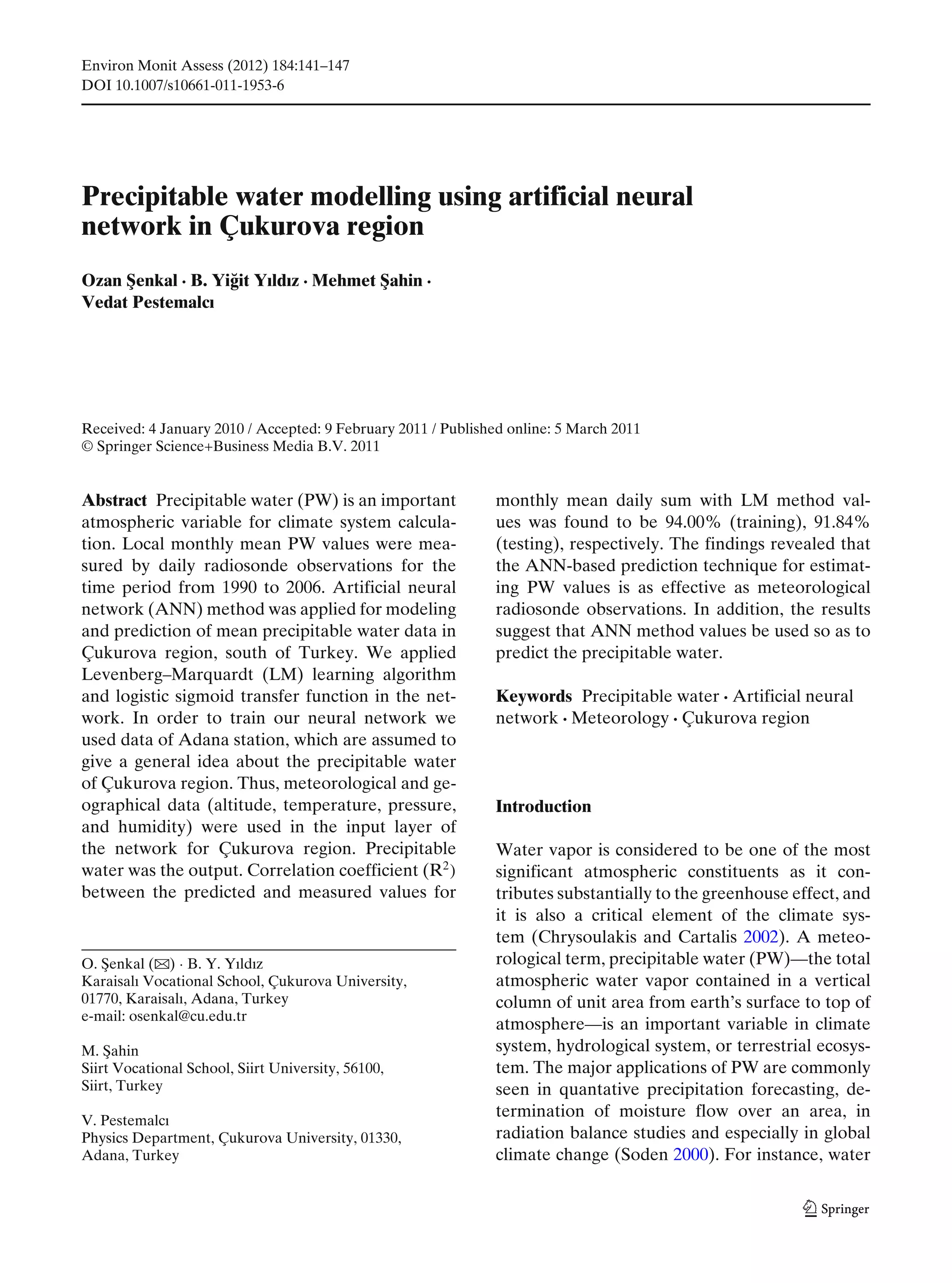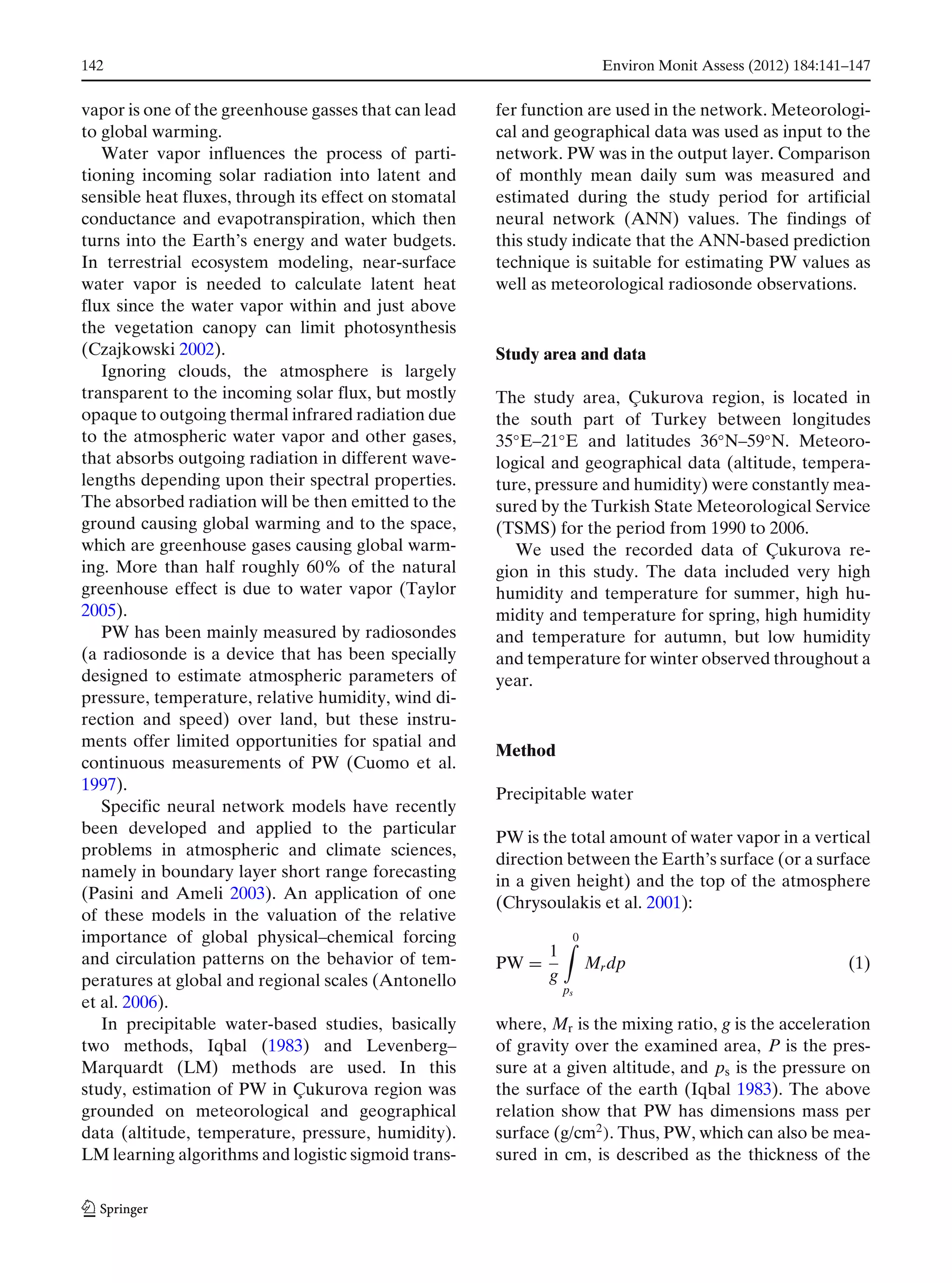 This document summarizes a study that used an artificial neural network to model and predict precipitable water values in the Çukurova region of Turkey. Meteorological and geographical data from 1990-2006 was used to train the neural network, with altitude, temperature, pressure, and humidity as inputs and precipitable water as the output. The neural network achieved a correlation of 94.0% between predicted and measured monthly mean precipitable water values for the training data and 91.8% for the testing data. The results demonstrated that an artificial neural network is effective at estimating precipitable water and can be used to predict values where observational data is limited.