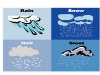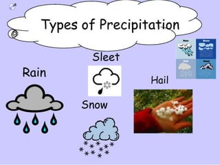Precipitation comes in several forms including rain which consists of drops of water, snow which are very small ice particles, sleet which are small frozen rain particles, and hail which are chunks of ice or frozen rain.