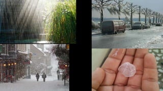 Precipitation forms when water vapor in clouds condenses around particles and becomes too heavy to remain suspended. It can fall as rain, freezing rain, sleet, snow, or hail depending on temperature. Rain forms below freezing when water droplets freeze on contact. Sleet forms when rain falls through below freezing air and freezes into ice pellets before hitting the ground. Snow forms when water vapor deposits directly onto nuclei as ice crystals below freezing through deposition. Hail forms in thunderstorms when ice crystals are carried up and down in the storm, accumulating concentric layers.