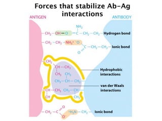 The document discusses the precipitin reaction, which involves an antibody binding to its antigen to form an insoluble complex. It precipitates out of solution, forming a visible precipitate. The optimal mutual proportions (OMP) of antigen and antibody yield the greatest amount of precipitation. To determine the OMP, serial dilutions of the antigen are made while keeping the antibody concentration constant. The dilution that produces the maximum amount of precipitation at the OMP. Experiments are described to perform precipitin reactions, analyze the results, and calculate values like the antibody concentration in the original antiserum.