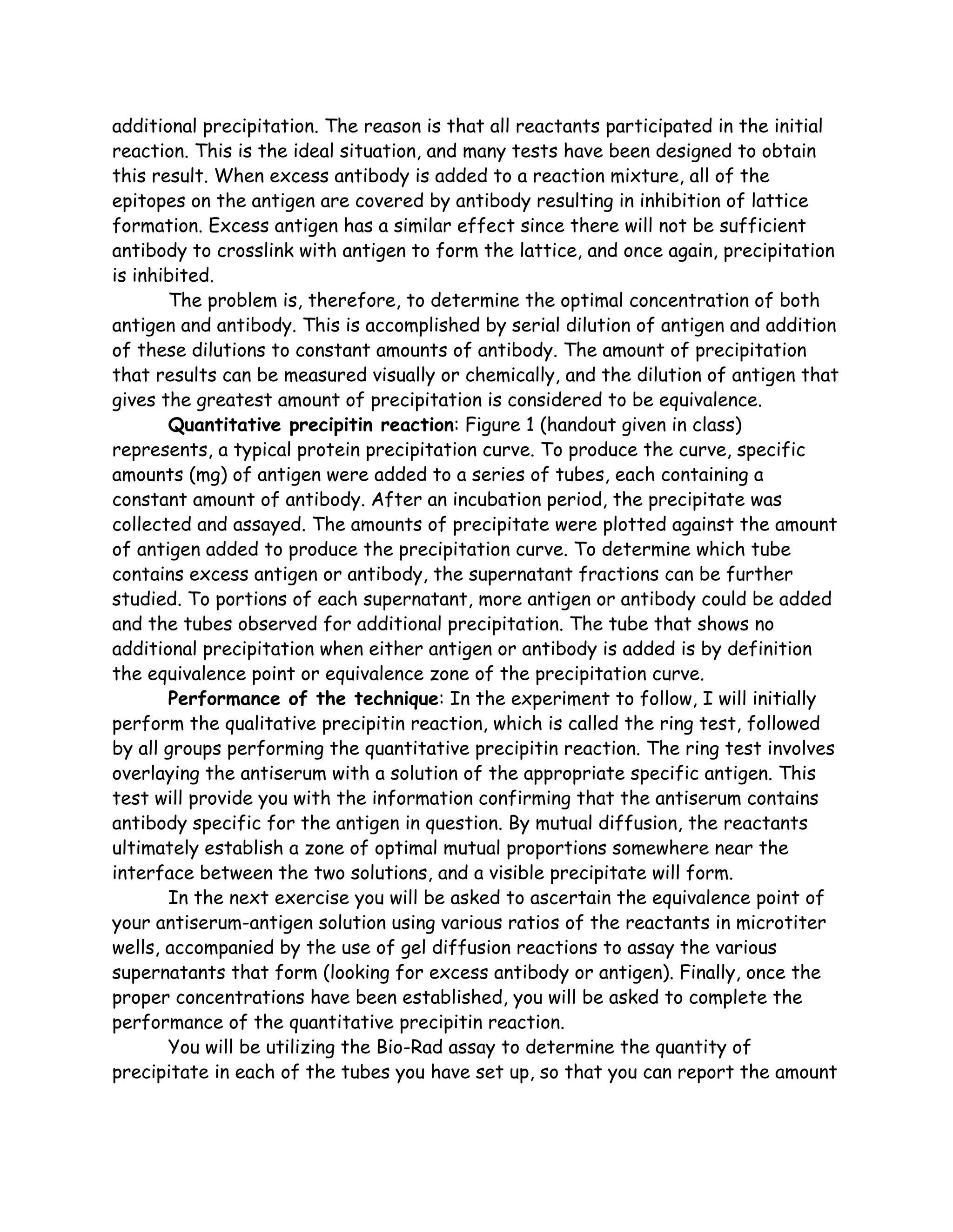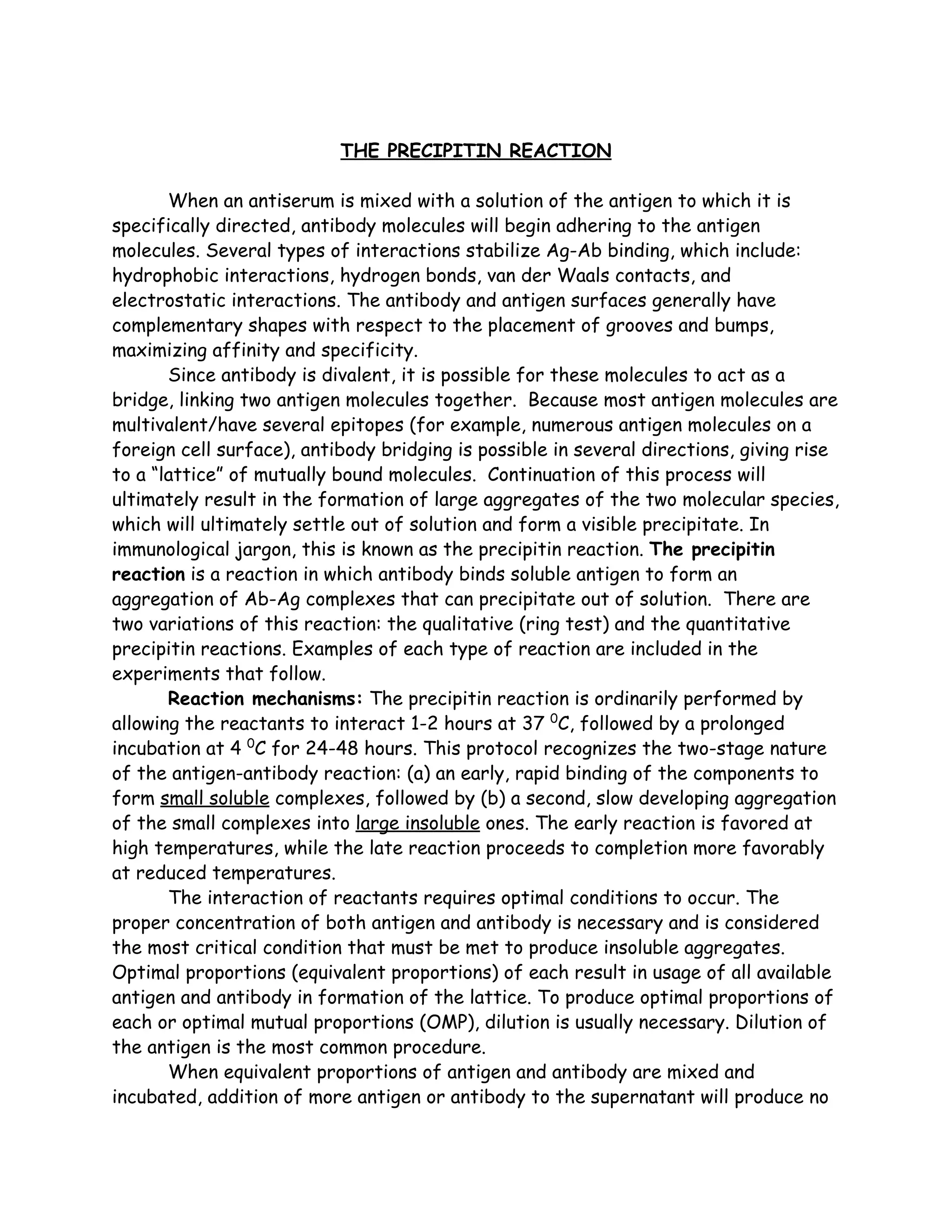 When an antiserum is mixed with the antigen it is directed against, antibody molecules will bind to antigen molecules via various interactions. Since antibodies are divalent, they can act as bridges between antigens, linking antigens together and forming aggregates. Continued bridging results in large precipitates that settle out of solution, known as the precipitin reaction. The precipitin reaction involves determining the optimal mutual proportions of antigen and antibody that result in maximum precipitation to identify the equivalence point.